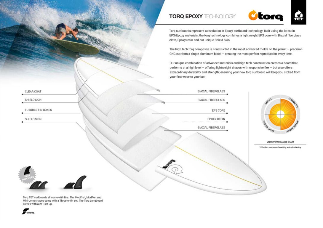 Le tavole Torq TET sono costruite con EPS ad alta densità, fibra di vetro biassiale e resina epossidica, utilizzando stampi in alluminio di precisione per garantire una forma e una qualità costante.